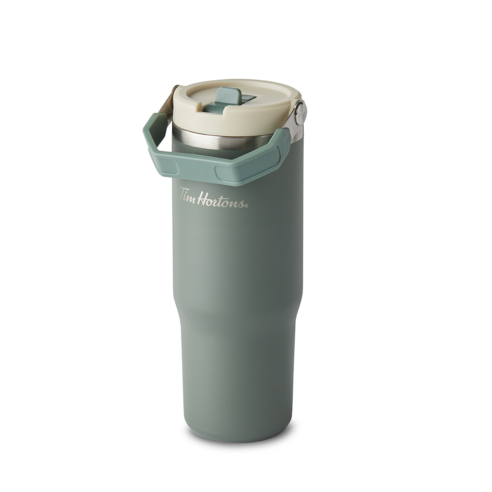 Drinkware never looked more stylish than with the Tim Hortons 30oz Top Handle Tumbler. This understated. sleek stainless steel tumbler comes with a convenient top handle. flip straw. and keeps drinks cold for up to 12 hours. Available in multiple colors. Save $0.10 on refills. offer valid in Canada only. Terms apply. Visit restaurant for details.